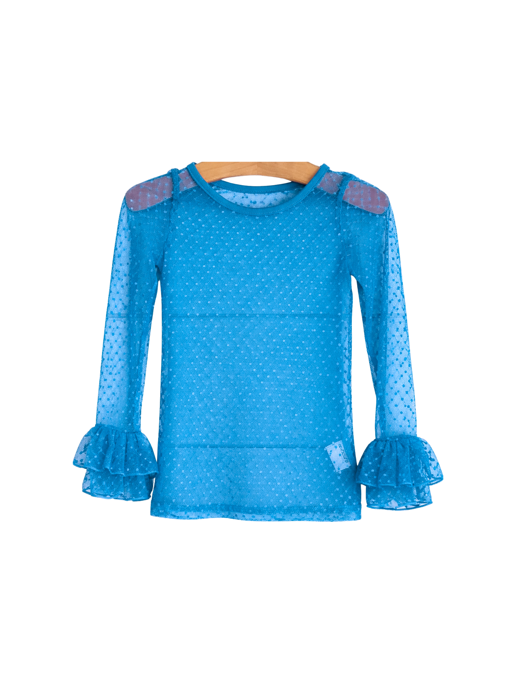 Long sleeve blue swiss dot layering top with ruffled sleeves