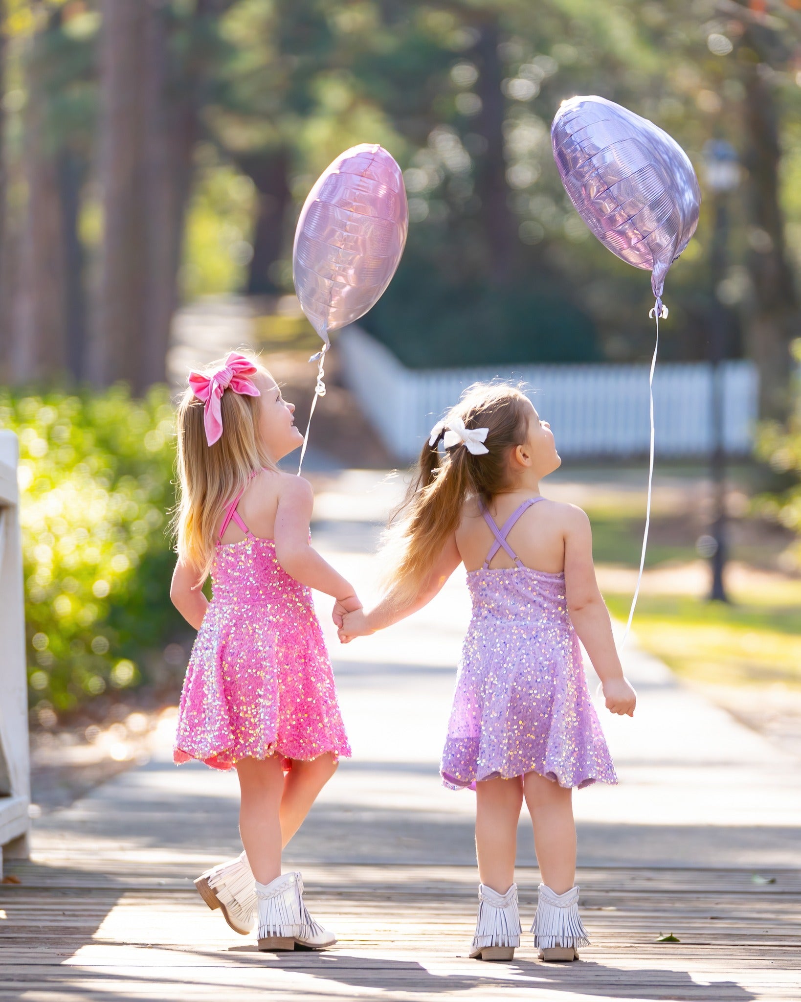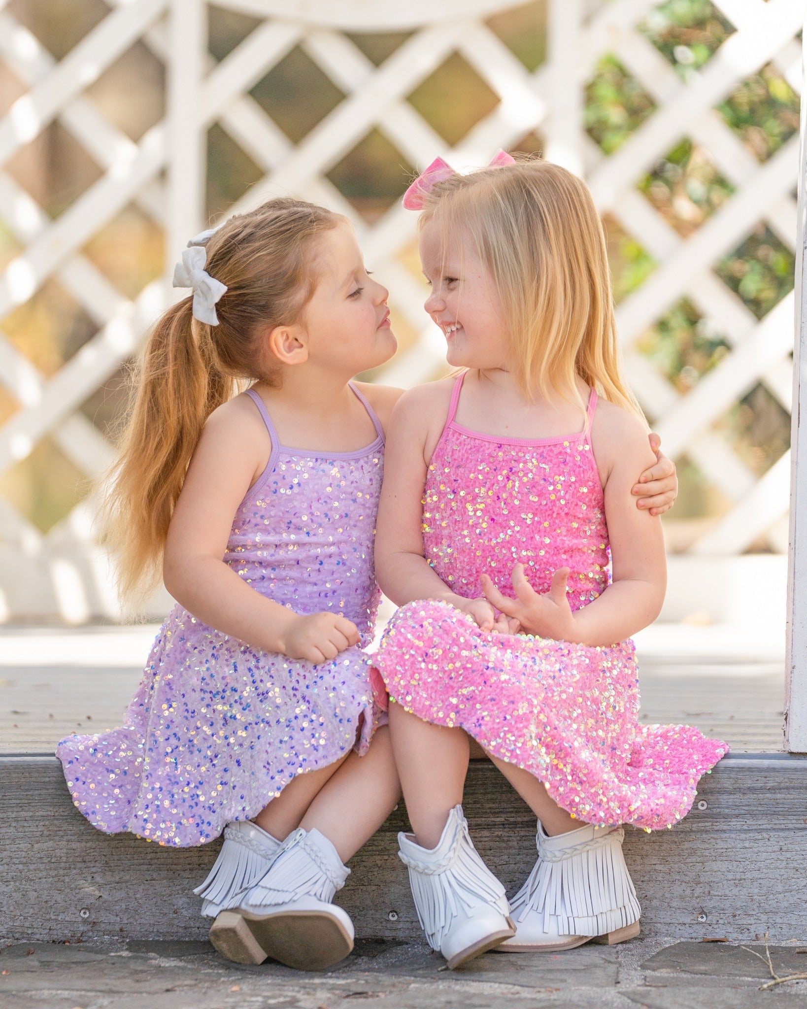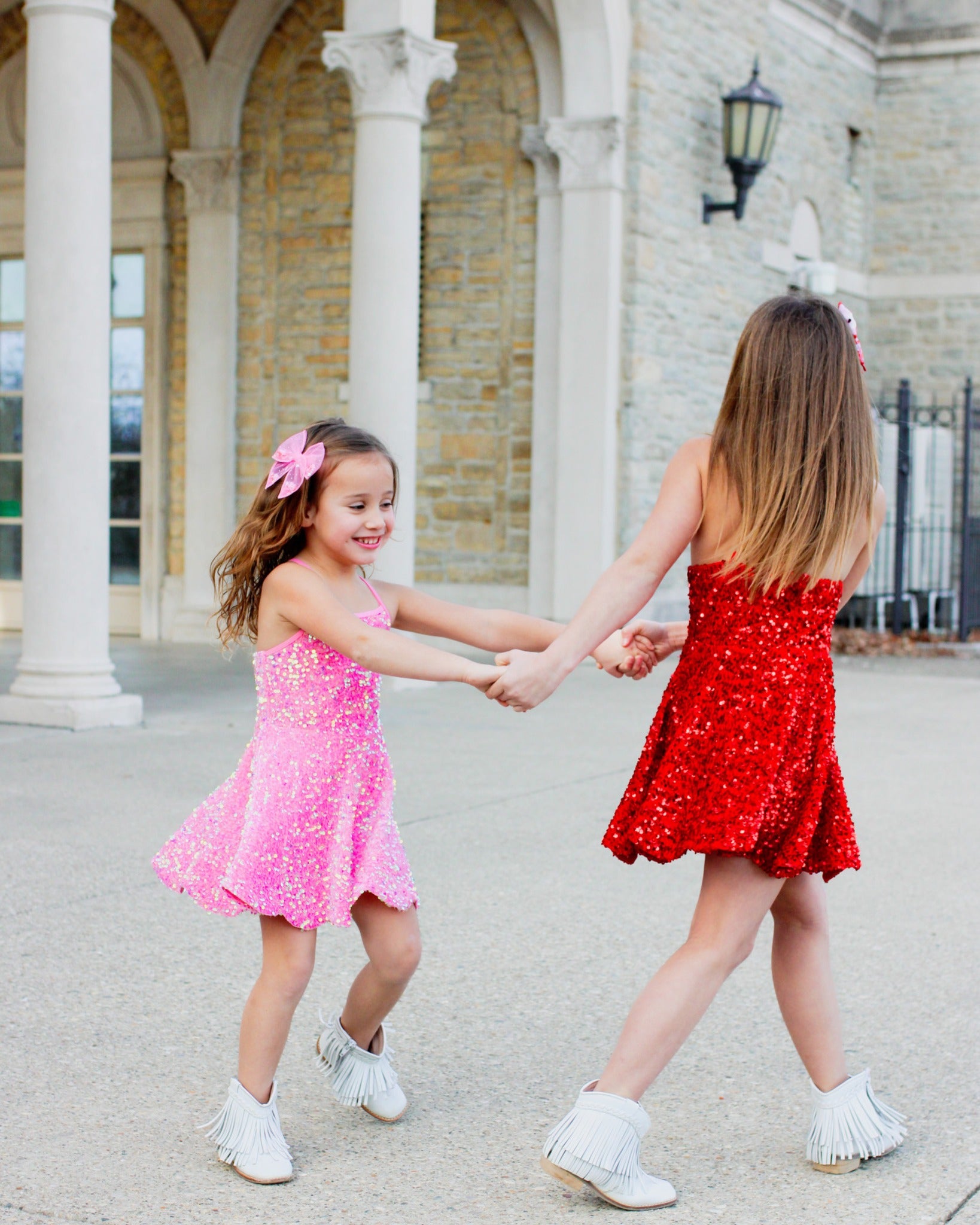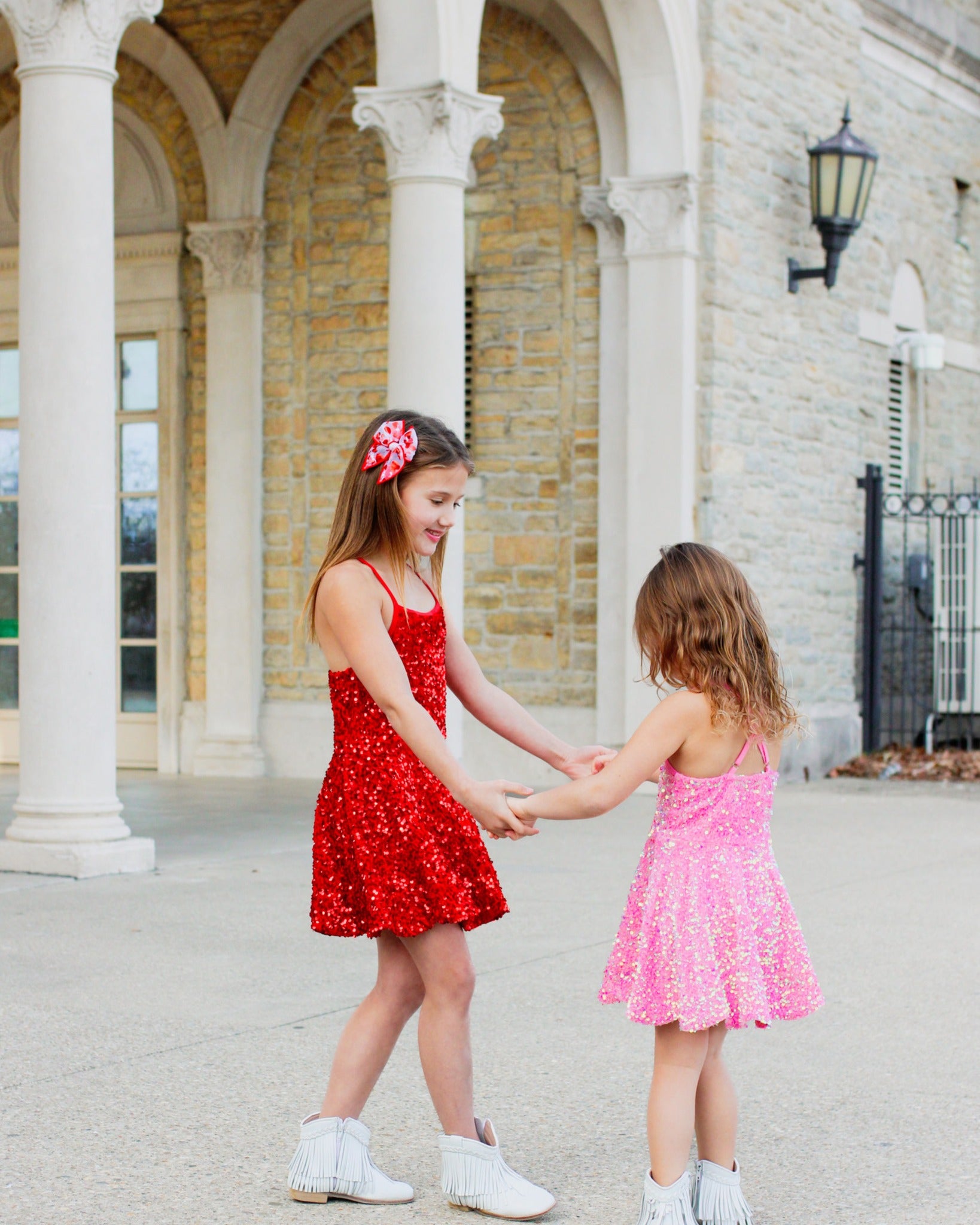 Let her sparkle in style! This adorable skort dress features soft velvet covered in shimmering sequins, a sweet scalloped hem, and built-in shorts for easy, comfy wear. Perfect for dances, birthdays, holidays, dress-up days, and more, it’s made for all her most magical moments.