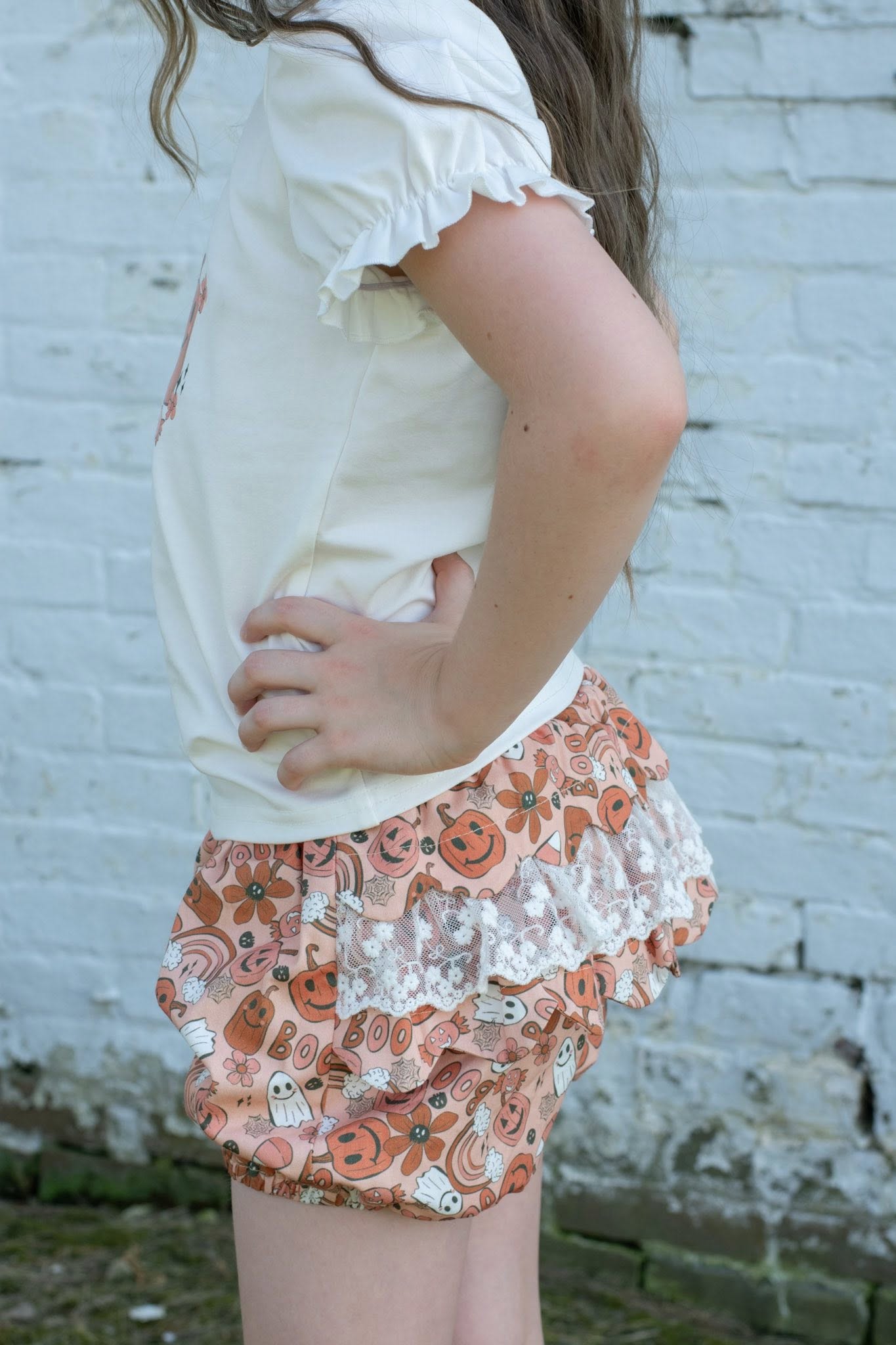 Short sleeved puff sleeved top and coordinating ruffled and lace bloomer shorts. Set runs true to size.