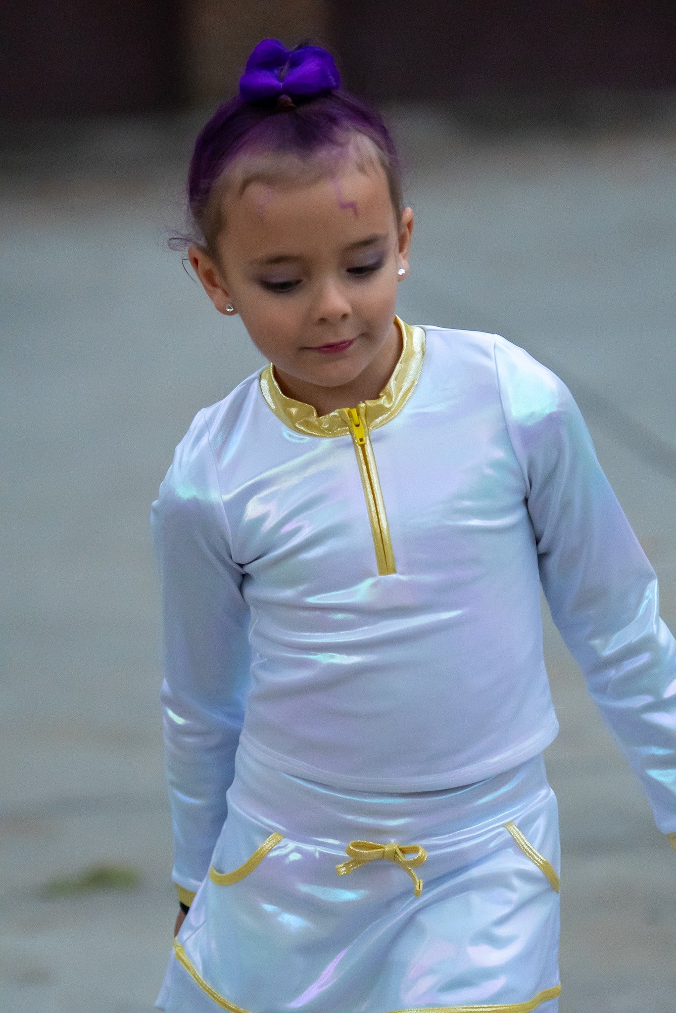 Designed for movement and style, our scalloped sport skort set is perfect for active days, whether it's a game, practice, or playtime. Made from high-quality yoga fabric Metallic Spandex), this skort offers a soft, stretchy fit that keeps up with every adventure. The built-in shorts provide extra coverage, so your little one can move with confidence and ease.